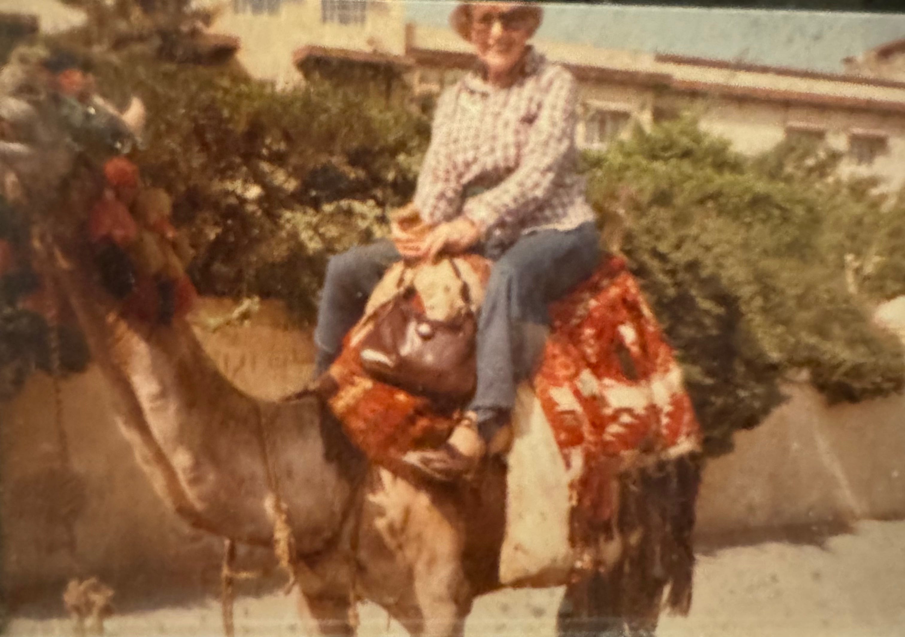 My grandfather was a hunter, so prized deer heads hung on the walls, and feathered pheasant sat in the deep freezer. I loved my grandfather but there was a lightness when he left, windows and doors blown open with sunshine and calm. He had an explosive temper, shouting, “Jesus, Mary, and Joseph!” when a grandchild made too much noise, but after his death, GrandMary’s warmth filled the house with an easy grace. She never raised her voice and made all her grandchildren feel welcome and loved whether it was a red sweater from Talbots, a chocolate milkshake at the “hot shop” diner on Wisconsin Avenue, or sharing a cup of tea and Sarah Lee Poundcake at her kitchen table on Burlington Place. After she was widowed, she traveled to 13 countries with Catholic tours, and every morning, I look at a picture of her sitting on a camel.