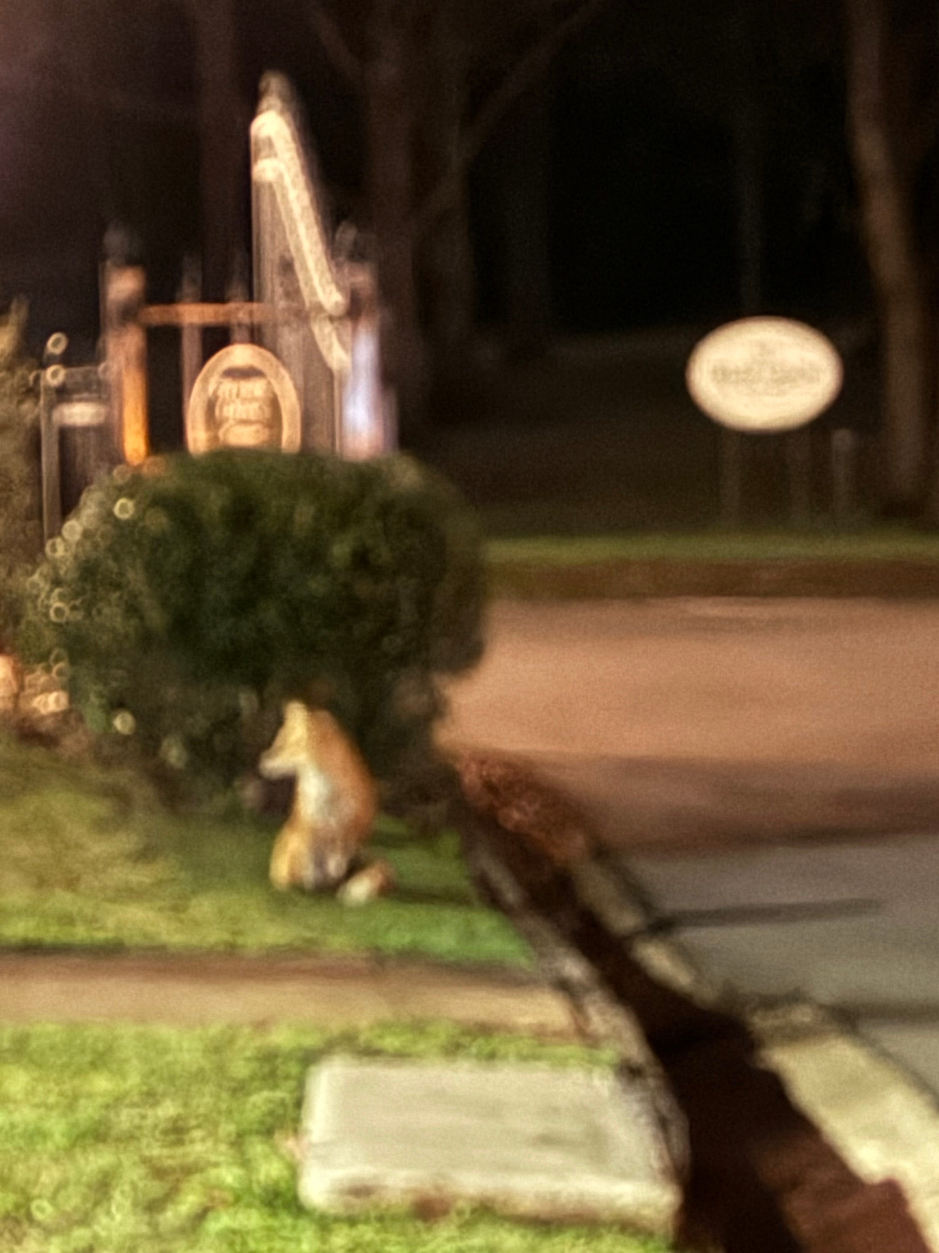 The day Mo died, we walked along Vulcan Trail late in the afternoon, and Kiffen saw a fox. He hasn’t seen a fox in almost fifty years. I have never seen a fox in the wild. I was a little jealous that Mo came to him instead of me, but two days later we were driving home, and this time, a fox sat on a street corner in our neighborhood as if she were waiting for us. I was able to snap a picture.