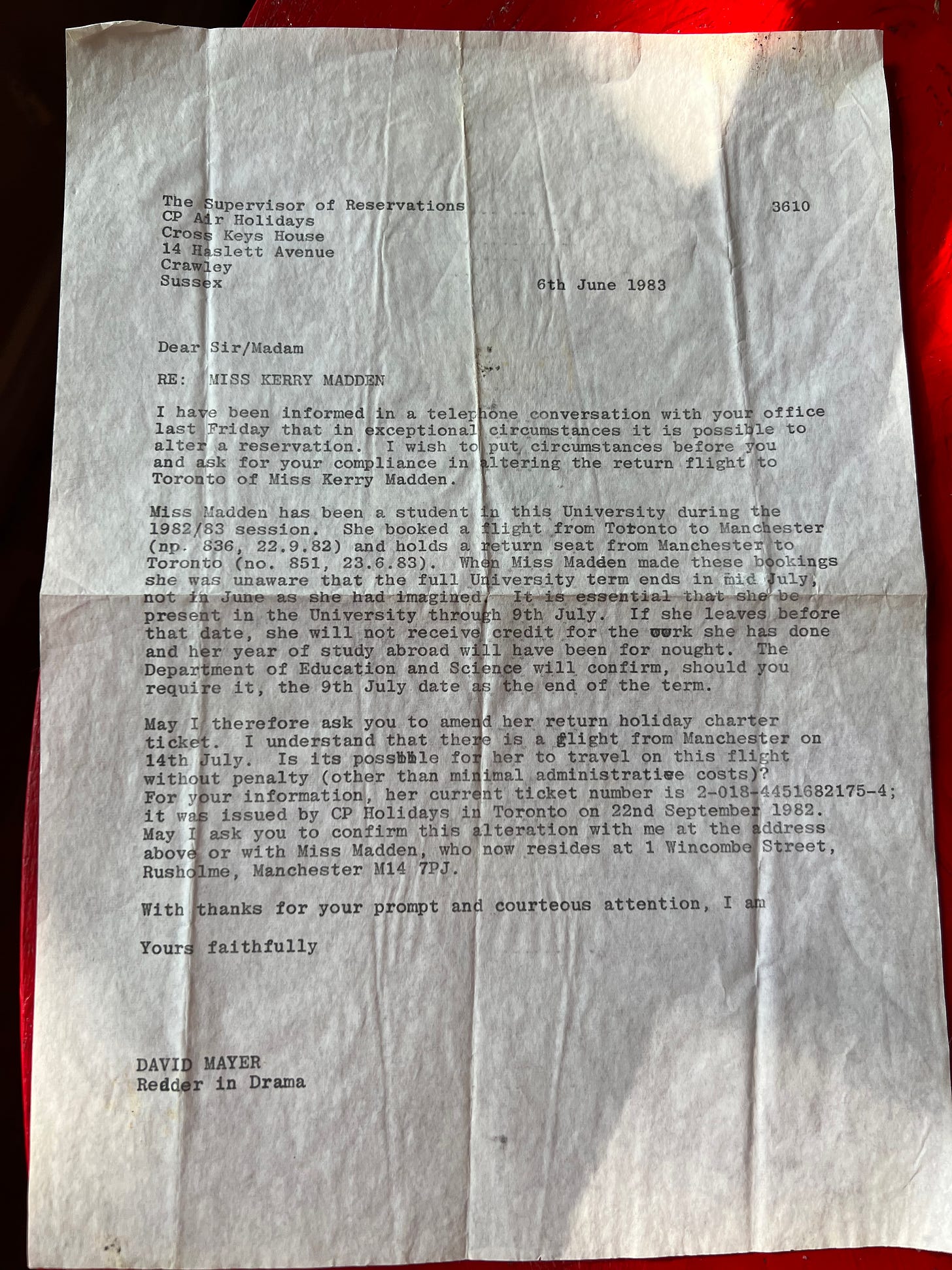 It’s a miracle I found the letter, but because of moving from California to Alabama, I found all my Manchester papers and letters that I had saved. Here is the letter. He explained to the Airlines that my year abroad would be “for nought” and they agreed.