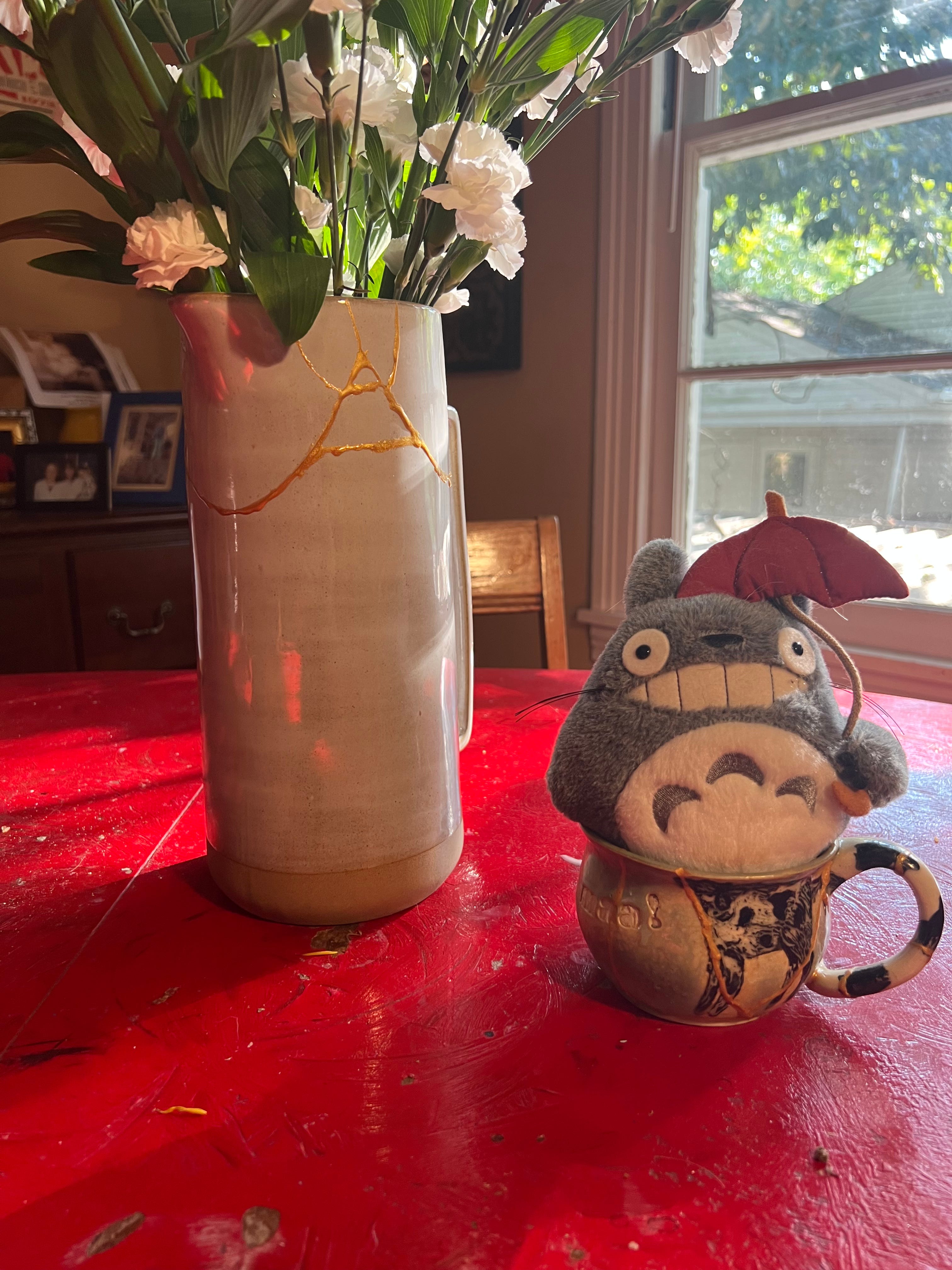 And it’s such a prettier vase now that it’s mended. Her friend, Simon, also broke a cup that my friend, Laya, made me of a cow, but I love the cup even more now that it’s glued together with gold. Both objects are infinitely more precious to me because I imagine Norah’s “you-tubing” lessons on Kintsugi to repair the objects. Norah was so worried that I’d be upset, but it was like they were new gifts all over again made with a kid’s love. I only recently stuck Totoro in the cup because he seemed to belong there.