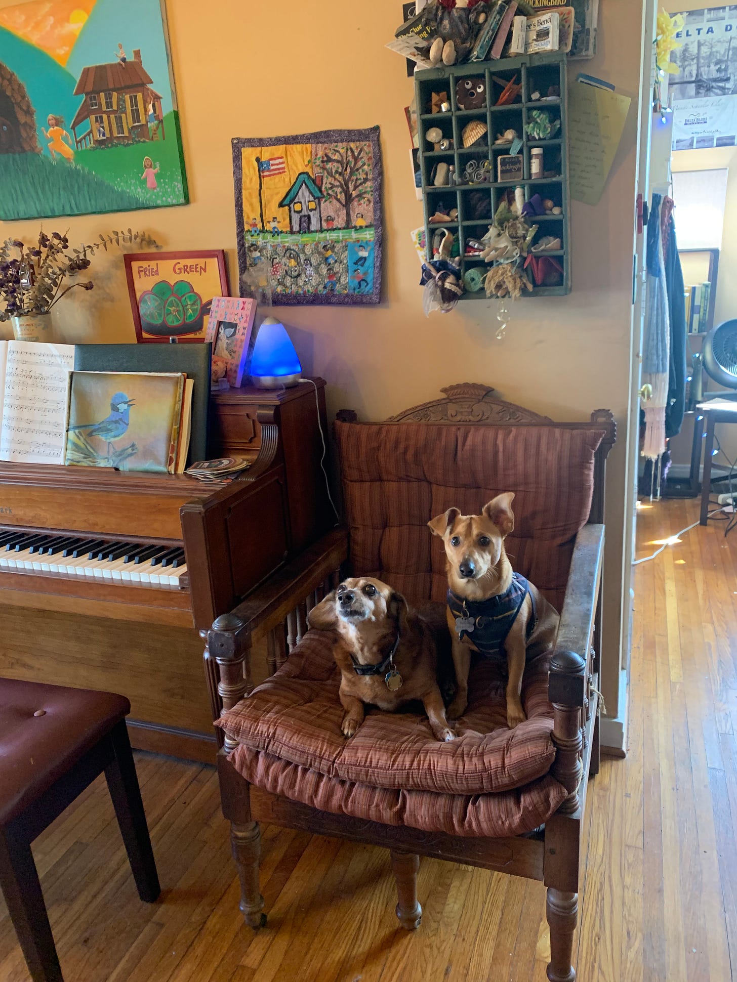 Here is the “grandmother chair” in a picture taken last year, and on the piano is a painting of a bluebird by Norah.